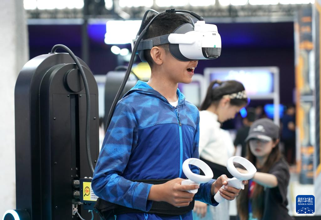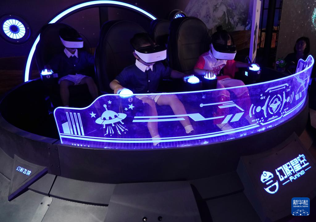 4月27日,小朋友在北京科幻嘉年华现场体验VR游戏。