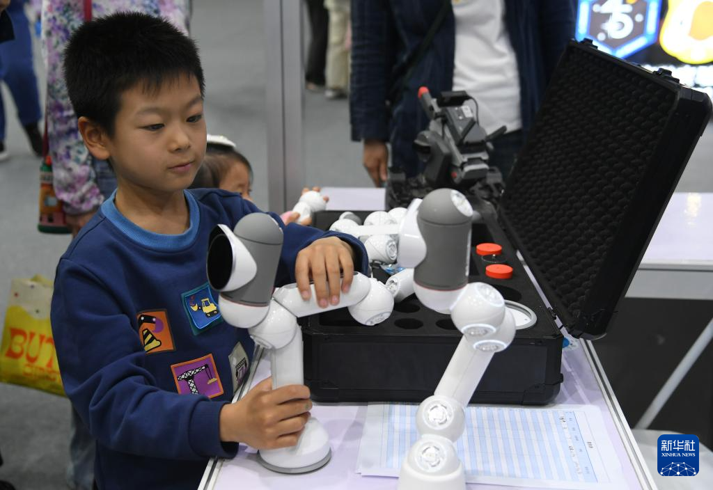4月27日,小朋友在北京科幻嘉年华现场组装一款机器人。
