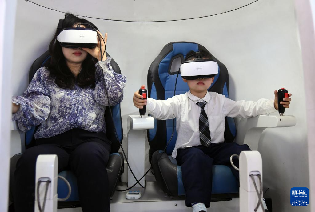4月27日,观众在北京科幻嘉年华现场体验“星球科考车”驾驶。