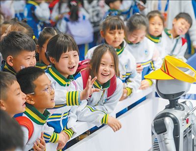 小朋友在中国科幻大会上观看机器人舞蹈表演。
